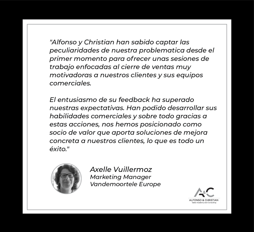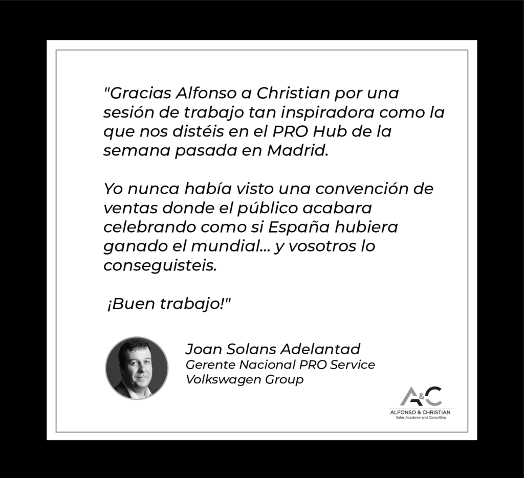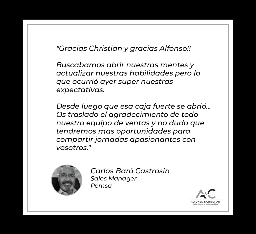 Ver cómo ponías en práctica la teoría ha sido impresionante. Sobre todo porque había alguna cosa de la primera sesión que pensaba que podría sonar muy forzada, pero al ver cómo lo hacías tú y cómo reaccionaban ellos, he visto que puede ser natural. Por cierto, ya te lo comenté ayer, pero me dejaste impresionada tirándote a la piscina de esa manera. Para mí eres un crack, atreverte a llamar en directo sin conocer el servicio, sin tener nada preparado…. Es la mejor formación en ventas que he tenido. ¡¡Tienes mi testimonio para todo lo que necesites!!